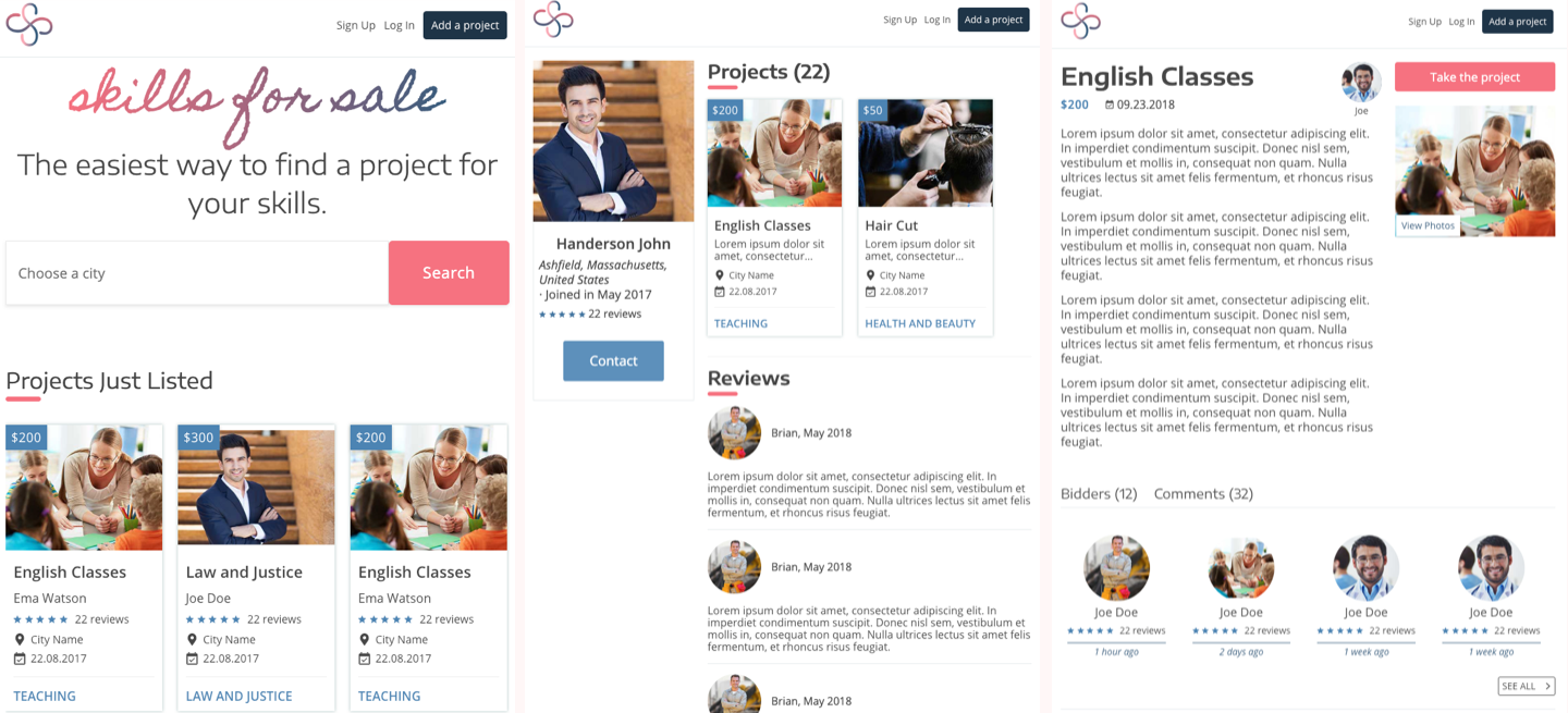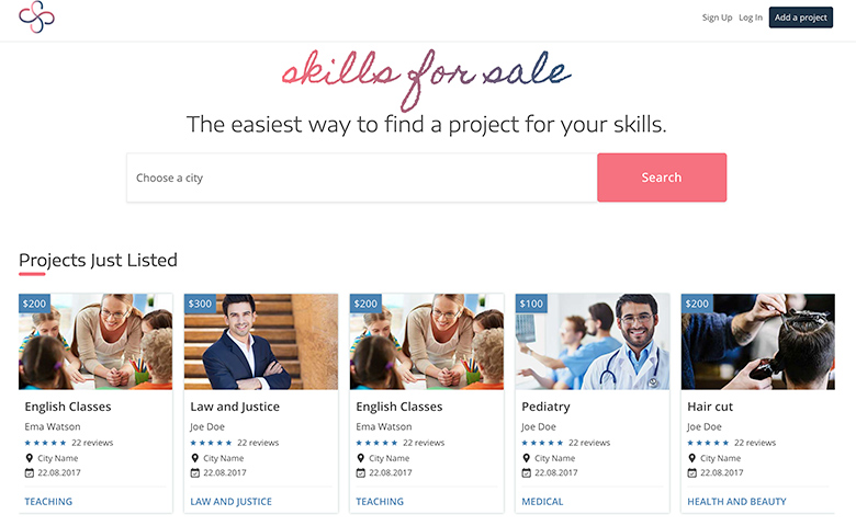 Skills for Sale is a startup project based on reviews, where people can list a personal project and find the proper team/person who is offering that service.