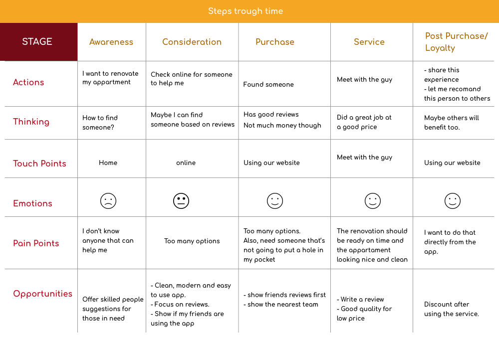 I used these two UX deliverables to put myself in customer’s shoe in scope to understand their motivations, problems and needs, emotions and to discover all the steps taken by a user to meet a specific goal.